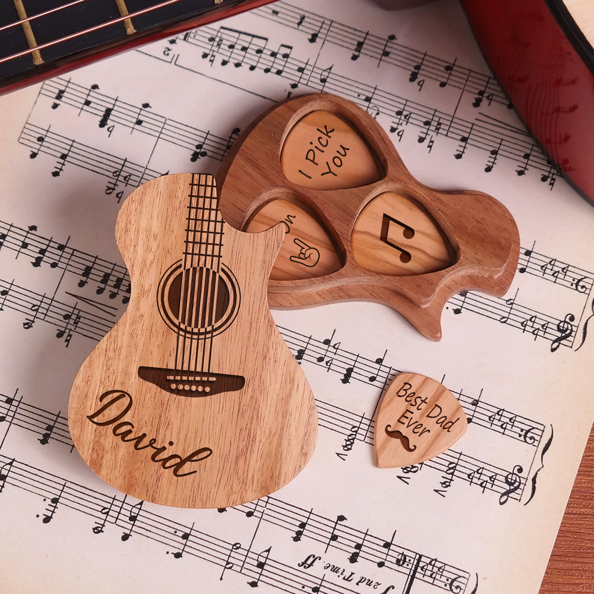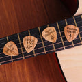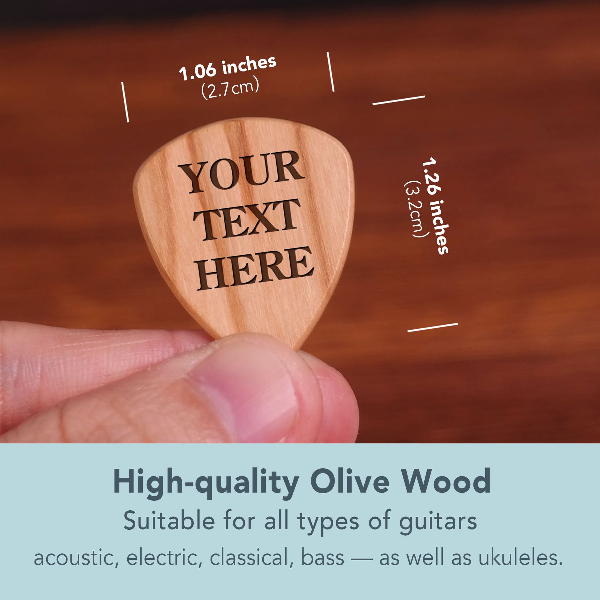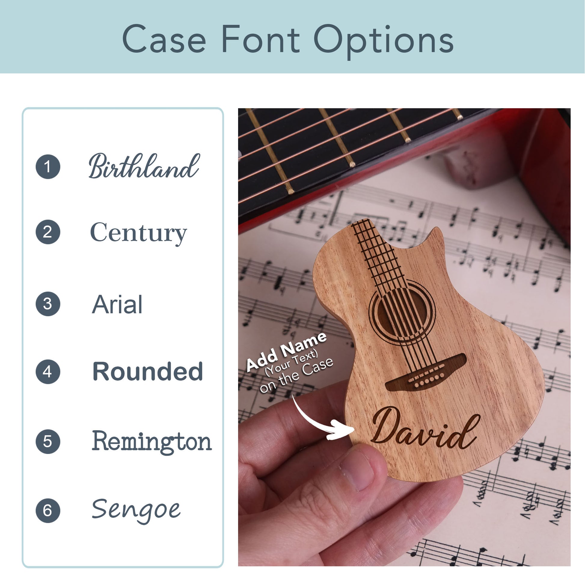 Each wooden guitar pick can be laser engraved with your choice of text — from dates, song lyrics, and favorite quotes or inside jokes. The solid wood case can be laser engraved with a name, adding a personal touch that makes every set truly one-of-a-kind.